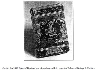 The document discusses the history of tobacco use and the efforts of tobacco companies to promote smoking globally and thwart effective tobacco control efforts. It traces the history of tobacco from its origins in the Americas in 6000 BC through its commercialization and the rise of big tobacco companies in the US and their expansion into international markets in the 20th century. It also summarizes how tobacco companies have spent billions on marketing, political lobbying, and misleading public information campaigns to influence governments and prevent tobacco control policies that impact their profits. Specifically in Malaysia, it notes the tobacco industry's successful lobbying of government ministries to weaken proposed advertising restrictions there in 1982.