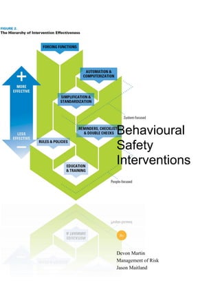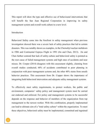This document discusses behavioral safety interventions that can benefit the San Juan Regional Corporation in improving its safety management system and safety culture. It outlines how behavioral safety focuses on continuous improvement through interventions like information sharing, training, supervision, teamwork, communication and management commitment. While effective for reducing accidents, behavioral interventions require proper implementation to avoid drawbacks like lack of trust between workers and management. Overall behavioral approaches aim to lower costs from accidents by improving culture and management through ongoing assessment and improvement.