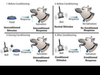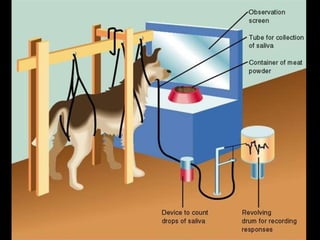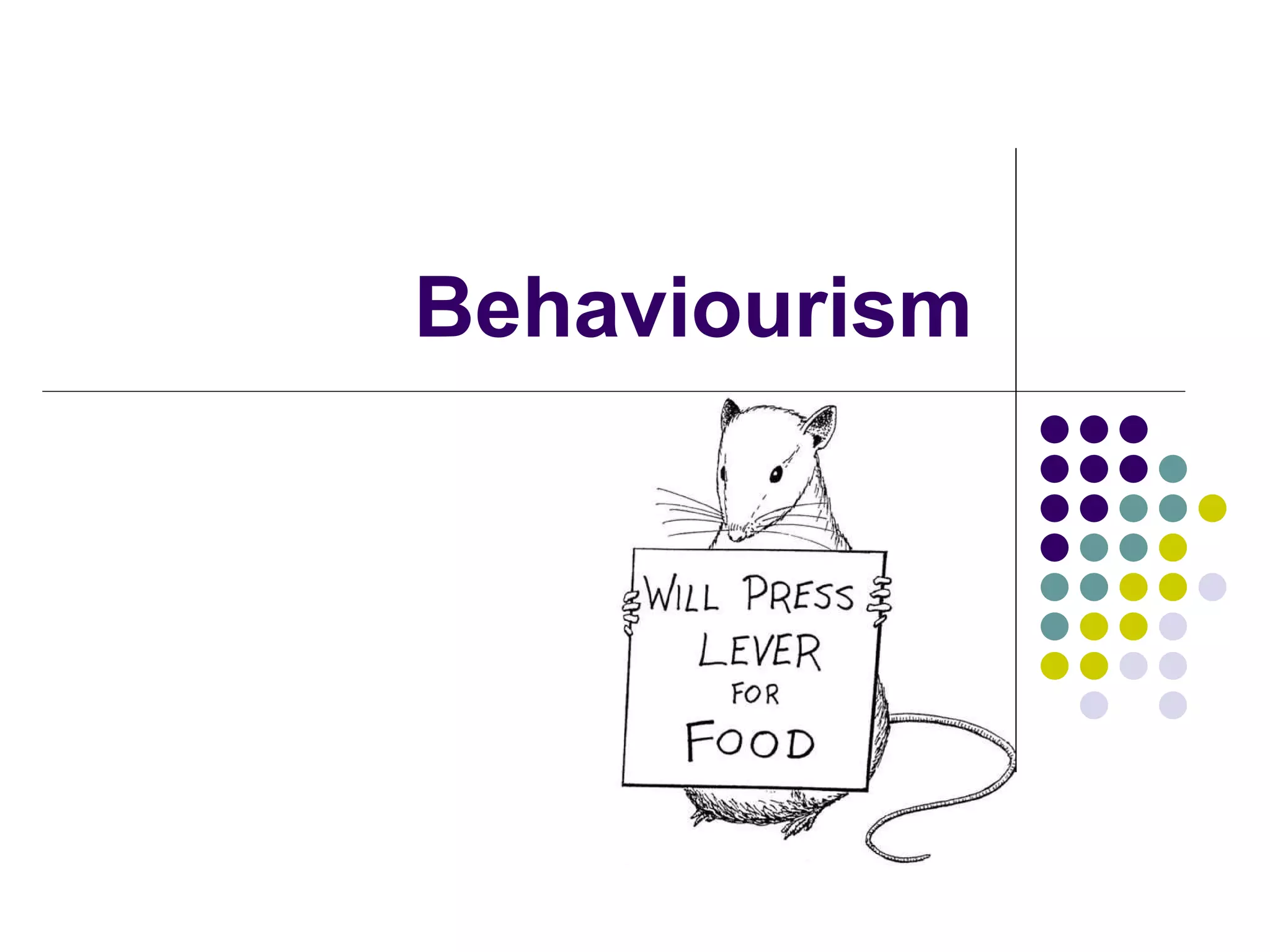 The document discusses the theory of behaviourism and some of its key proponents. Behaviourism argues that behaviour is the only objective thing that can be studied, not internal mental states. Some of the theorists discussed include Ivan Pavlov, Edward Thorndike, John B. Watson, and B.F. Skinner. Their work involved classical conditioning experiments with animals and humans to understand learning through stimulus-response associations and reinforcement.