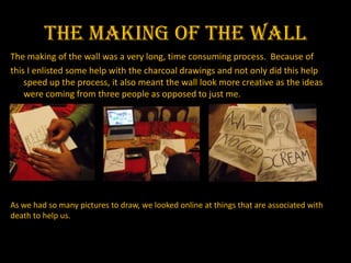 The making of the wall setting for the film was a time-consuming process, so the creator enlisted help with charcoal drawings to speed up the process and add more creative ideas. Pictures associated with death were found online and stuck onto a blanket, which was then nailed to the wall to avoid damaging the wallpaper. Some pictures were left uncovering to show the process was unfinished, and props like tea lights and a vodka bottle were placed on tables to add to the unsettling atmosphere. The makeup was also carefully designed to portray the characters' states of mind, using powder, fake blood, and charcoal to make them appear pale, drained, and tired.