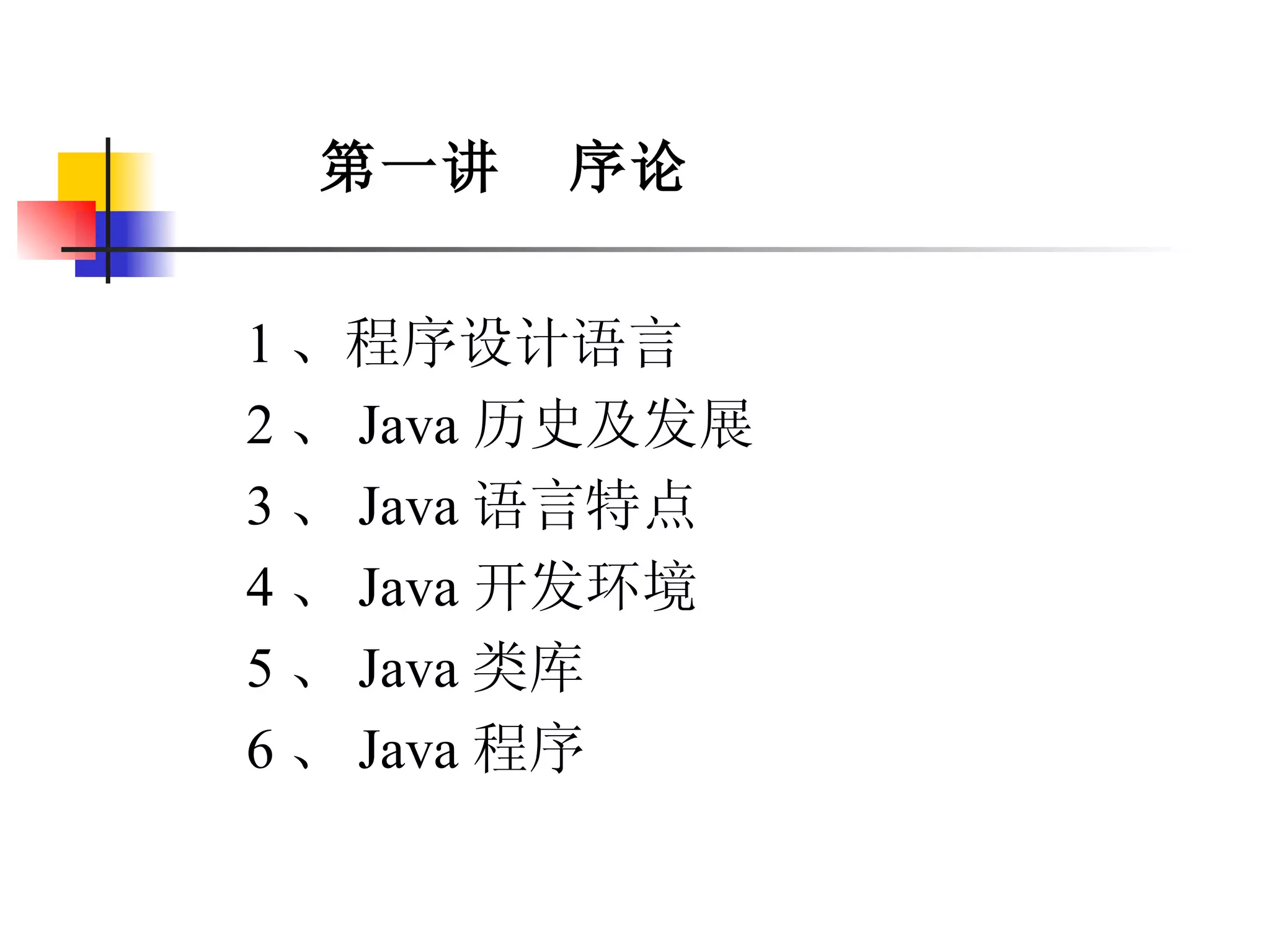 Java 程序由各种类( class)组成 你自己编写的类 ( Java class libraries——Java API ) JDK——Java Development Kit(1.1~1.4) 独立软件供应商、免费软件 / 共享软件 几点提示 使用类库可以 提高软件重用 / 提高效率 / 提高移植性 网络上有许多开放的 Java 源码资源 5 、 Java 类库