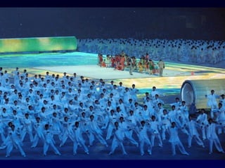 The Beijing Olympic Games opening ceremony was held on August 8, 2008 at 8:08 PM. The ceremony featured a performance by Canadian singer Celine Dion, who sang "My Heart Will Go On" from the film Titanic.