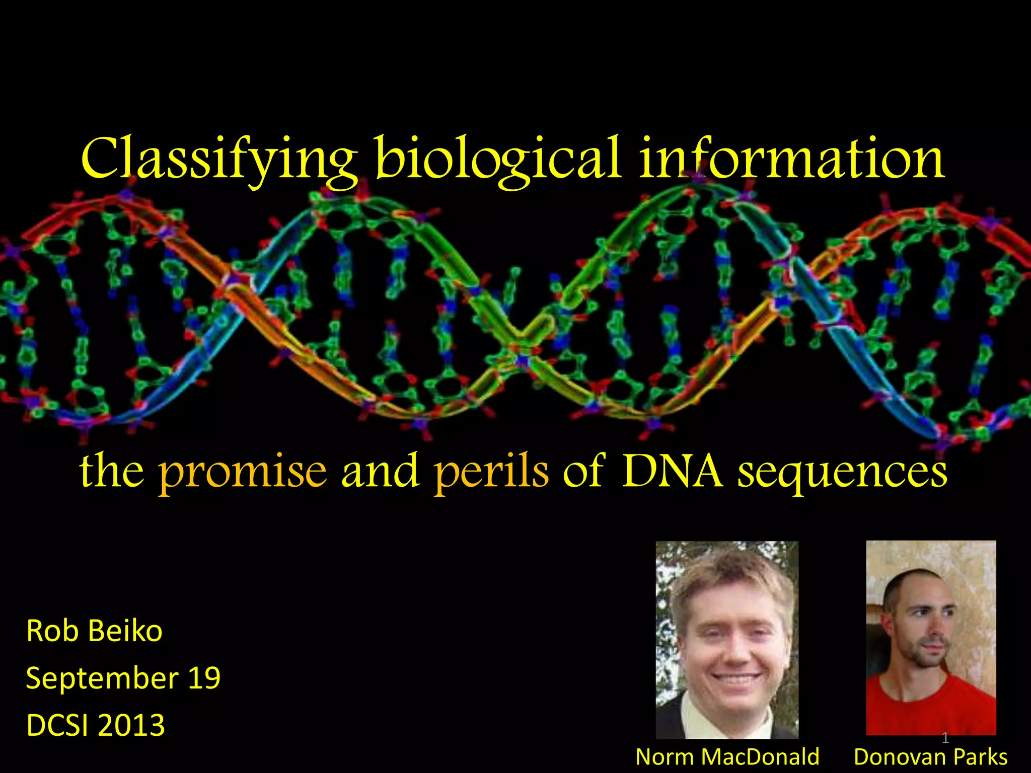The document discusses classifying biological information from DNA sequences and summarizes some of the challenges involved. It notes that classifying organisms based on their genomes involves determining which genes are responsible for unique properties and can identify organisms. Machine learning techniques like association rule mining are used to discover relationships between genes and phenotypes. However, classifying organisms is challenging due to interactions between genes and effects of taxonomy. Metagenomics, which involves classifying short DNA sequences from environmental samples, poses additional challenges due to analyzing mixtures of many microbial species simultaneously.