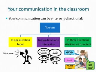 The document provides an overview of strategies and activities for teaching bilingual classes, including: