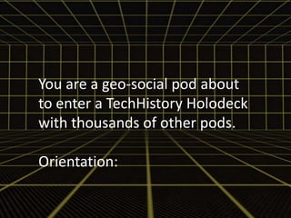 In 2044, participants enter a techhistory holodeck for an immersive experience of university life in 2014, showcasing the technological advancements and cultural differences of the period. Attendees will remember their 2044 knowledge but may experience challenges due to the historical digital divide. The experience is facilitated by a holographic connector and features past technologies such as hand-held devices and social media platforms.