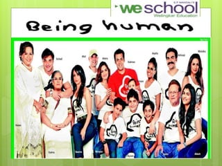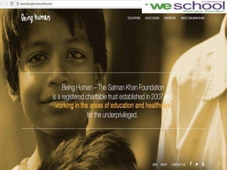This document summarizes the marketing application and strategy of an NGO group presentation. It discusses the group members who presented and provides links to research on marketing strategies used by NGOs. It then covers the brand strategy, positioning, sponsorship, name selection, and source of income of the Being Human brand. Specifically, it notes that 75% of funds come from Salman Khan through charitable shows and branded products. It also discusses the products, promotion, pricing, place, segmentation, targeting, and positioning strategies of Being Human.