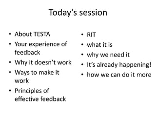 This document discusses feedback and Research-Informed Teaching (RIT) in higher education. It provides an overview of the TESTA program which aims to improve feedback through a modular approach. Student feedback revealed that current feedback is often not helpful for improvement and focuses too much on grades rather than progress. The document advocates for closing the feedback loop and involving students more in feedback and assessment. RIT is presented as an opportunity to link teaching and research more closely through activities like action research or student involvement in disciplinary research. Effective implementation of feedback principles and increased RIT could help address issues around student engagement and learning.