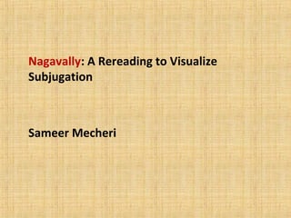This document analyzes the film Manichithrathazhu from the perspectives of gaze and the subjugation of women. It discusses how the film uses male gaze to objectify and subjugate female characters. Specifically, it notes how the introduction of the character Nagavally resists this gaze yet she is deeply penetrated into audiences. It also analyzes scenes where the female lead Ganga is introduced with frightening music and lighting, and another scene where her dance is filmed focusing on the expressions of male characters gazing at her. The document concludes the film constructs women as passive objects of the male gaze, representing their subjugation and absence of agency.