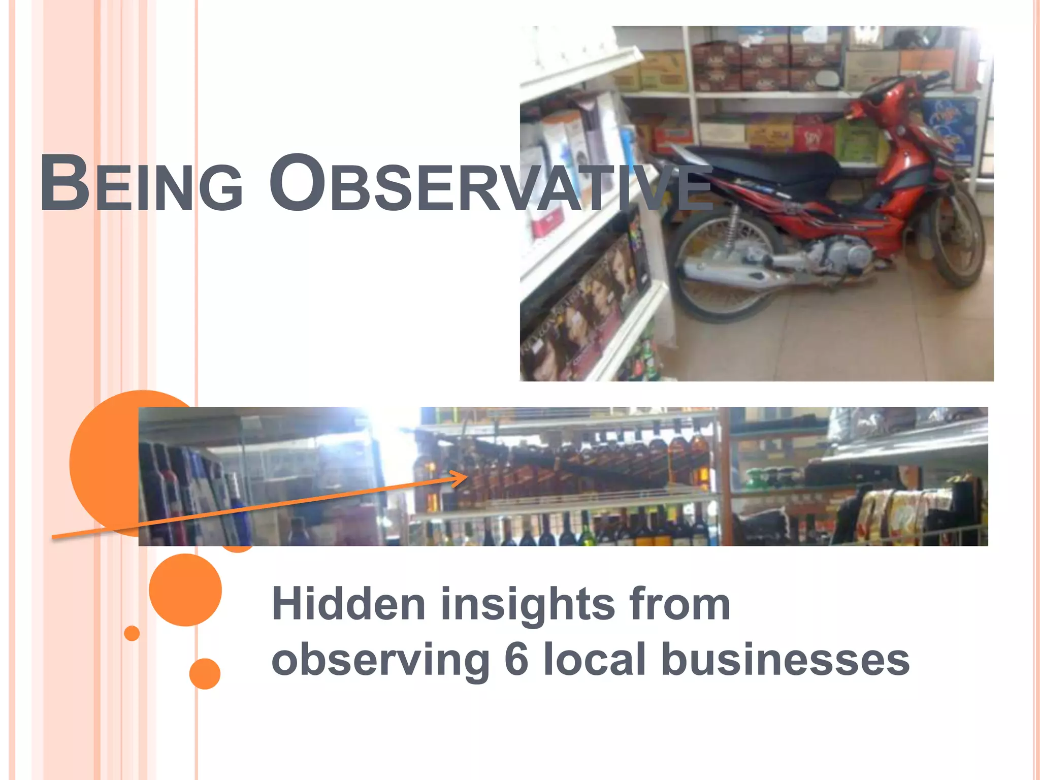 The document observes several local businesses and notes things like store organization, customer traffic patterns, lighting, and opportunities for improvement. The convenient store allows customers to play their own music and hang out, attracting many patrons despite higher prices. The cafe boutique could better integrate its gift shop into the cafe to provide more seating and browsing opportunities. Overall the document makes observations about store environments and customer experiences that could inform business strategies.