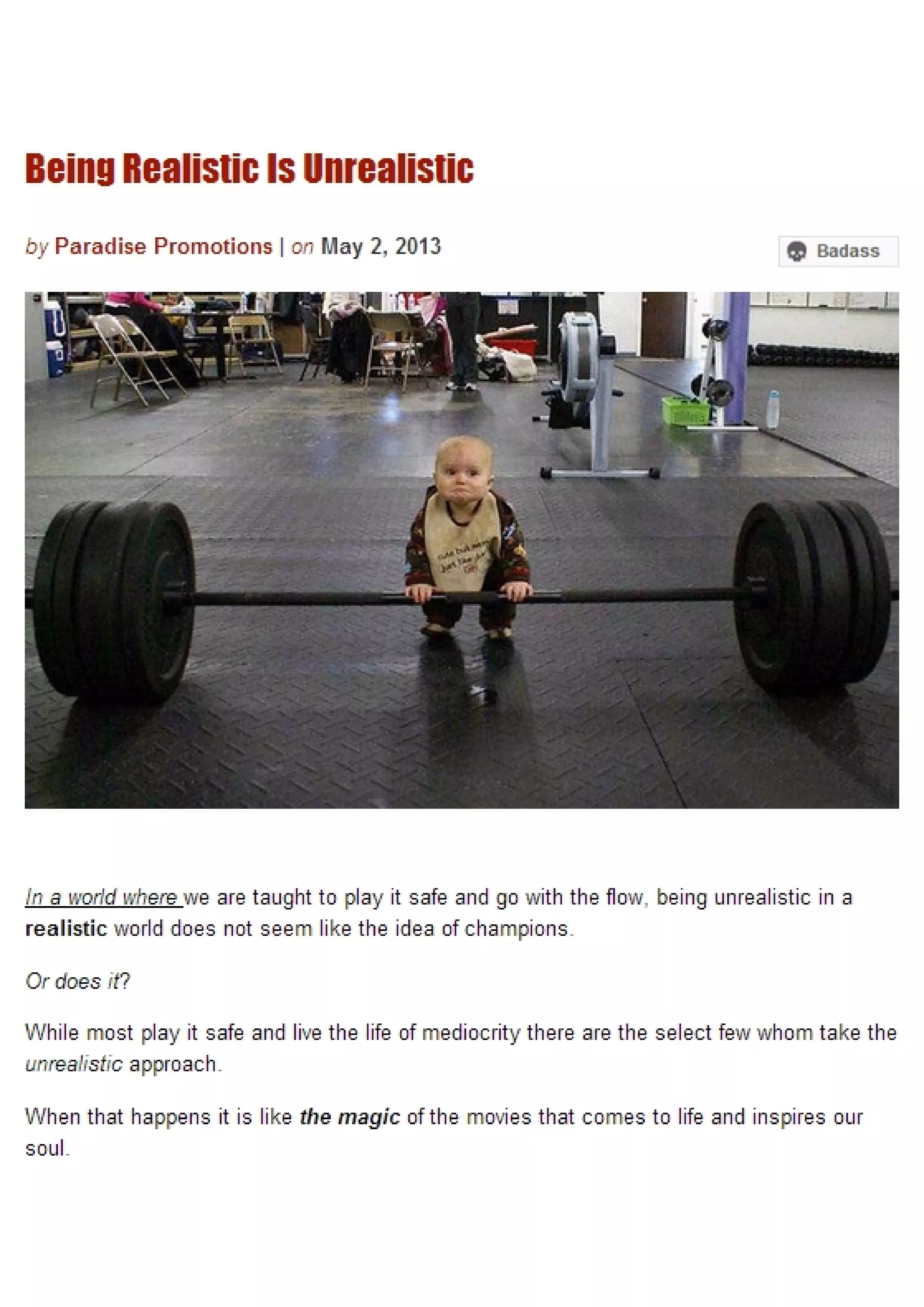 In a world where we are taught to play it safe and go with the flow, being unrealistic in a realistic world does not seem like the idea of champions. Or does it? While most play it safe and live the life of mediocrity there are the select few whom take the unrealistic approach. When that happens it is like the magic of the movies that comes to life and inspires our soul.