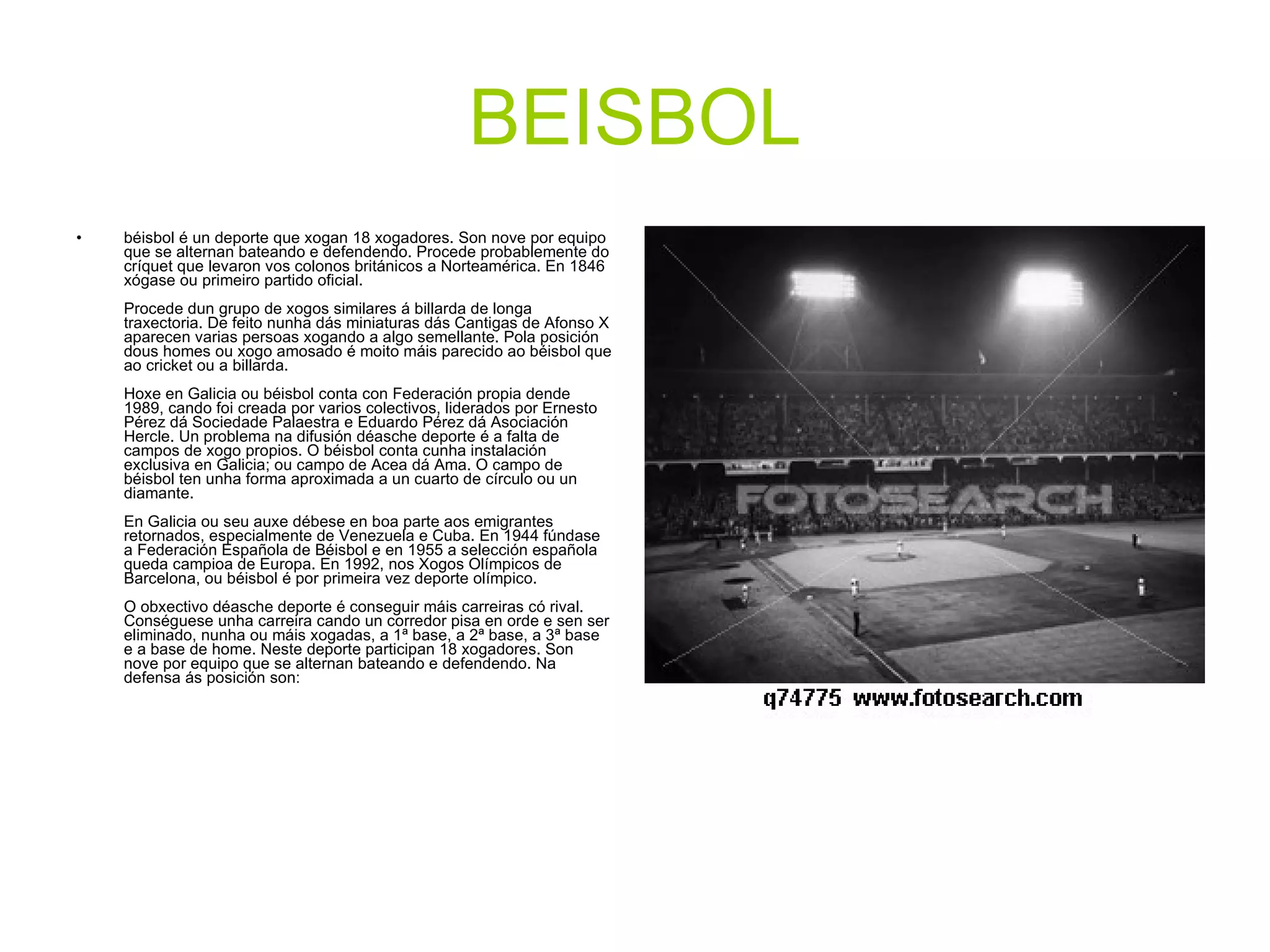 BEISBOL béisbol éun deporte que xogan 18 xogadores. Son nove por equipo que se alternan bateando e defendendo. Procede probablemente do críquet que levaron vos colonos británicos a Norteamérica. En 1846 xógase ou primeiro partido oficial. Procede dun grupo de xogos similares á billarda de longa traxectoria. De feito nunha dás miniaturas dás Cantigas de Afonso X aparecen varias persoas xogando a algo semellante. Pola posición dous homes ou xogo amosado é moito máis parecido ao béisbol que ao cricket ou a billarda. Hoxe en Galicia ou béisbol conta con Federación propia dende 1989, cando foi creada por varios colectivos, liderados por Ernesto Pérez dá Sociedade Palaestra e Eduardo Pérez dá Asociación Hercle. Un problema na difusión déasche deporte é a falta de campos de xogo propios. O béisbol conta cunha instalación exclusiva en Galicia; ou campo de Acea dá Ama. O campo de béisbol ten unha forma aproximada a un cuarto de círculo ou un diamante. En Galicia ou seu auxe débese en boa parte aos emigrantes retornados, especialmente de Venezuela e Cuba. En 1944 fúndase a Federación Española de Béisbol e en 1955 a selección española queda campioa de Europa. En 1992, nos Xogos Olímpicos de Barcelona, ou béisbol é por primeira vez deporte olímpico. O obxectivo déasche deporte é conseguir máis carreiras có rival. Conséguese unha carreira cando un corredor pisa en orde e sen ser eliminado, nunha ou máis xogadas, a 1ª base, a 2ª base, a 3ª base e a base de home. Neste deporte participan 18 xogadores. Son nove por equipo que se alternan bateando e defendendo. Na defensa ás posición son: