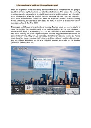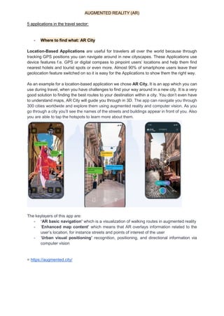 Augmented reality applications are increasingly being used in the travel sector to enhance the tourist experience. Location-based apps like AR City use GPS and computer vision to provide navigation assistance and information about points of interest. AR is also being used to showcase historical sites through virtual reconstructions, like the Yuanmingyuan gardens in Beijing. Hotels are exploring AR for digital room keys, interactive directories, and celebrity meet-and-greets. Restaurant recommendation apps like BuUuk locate dining options and display interactive menus and reviews to share local culture through food.