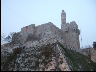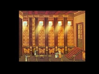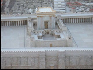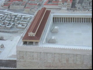The model displays ancient Jerusalem in 66 CE at its peak before being destroyed, covering 445 acres. It shows the Second Temple of Jerusalem at a scale of 1:50. The original Second Temple was rebuilt by Herod the Great between 19 BCE-64 CE, requiring 10,000 laborers as only priests could access parts of the building. The city and Temple were both destroyed by the Romans in 70 CE, scattering Jewish communities, though some ruins like the Western Wall remain in the modern city, now home to religious sites of Jews, Christians and Muslims.