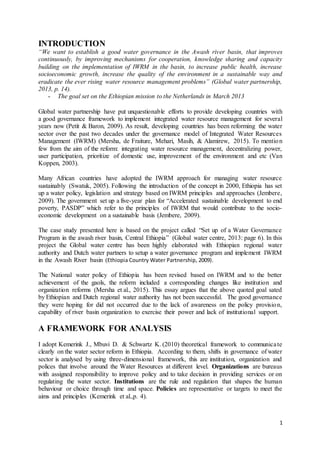 This document discusses water sector reform and implementation of integrated water resource management (IWRM) in the Awash River Basin in Ethiopia. It outlines the goal of establishing good water governance through improving cooperation, knowledge sharing, and capacity building. It discusses how Ethiopia adopted IWRM principles in water policies and established organizations like river basin authorities. However, it argues the goal of good governance has not been achieved due to a lack of awareness of policies, the capabilities of river basin organizations, and insufficient institutional support.