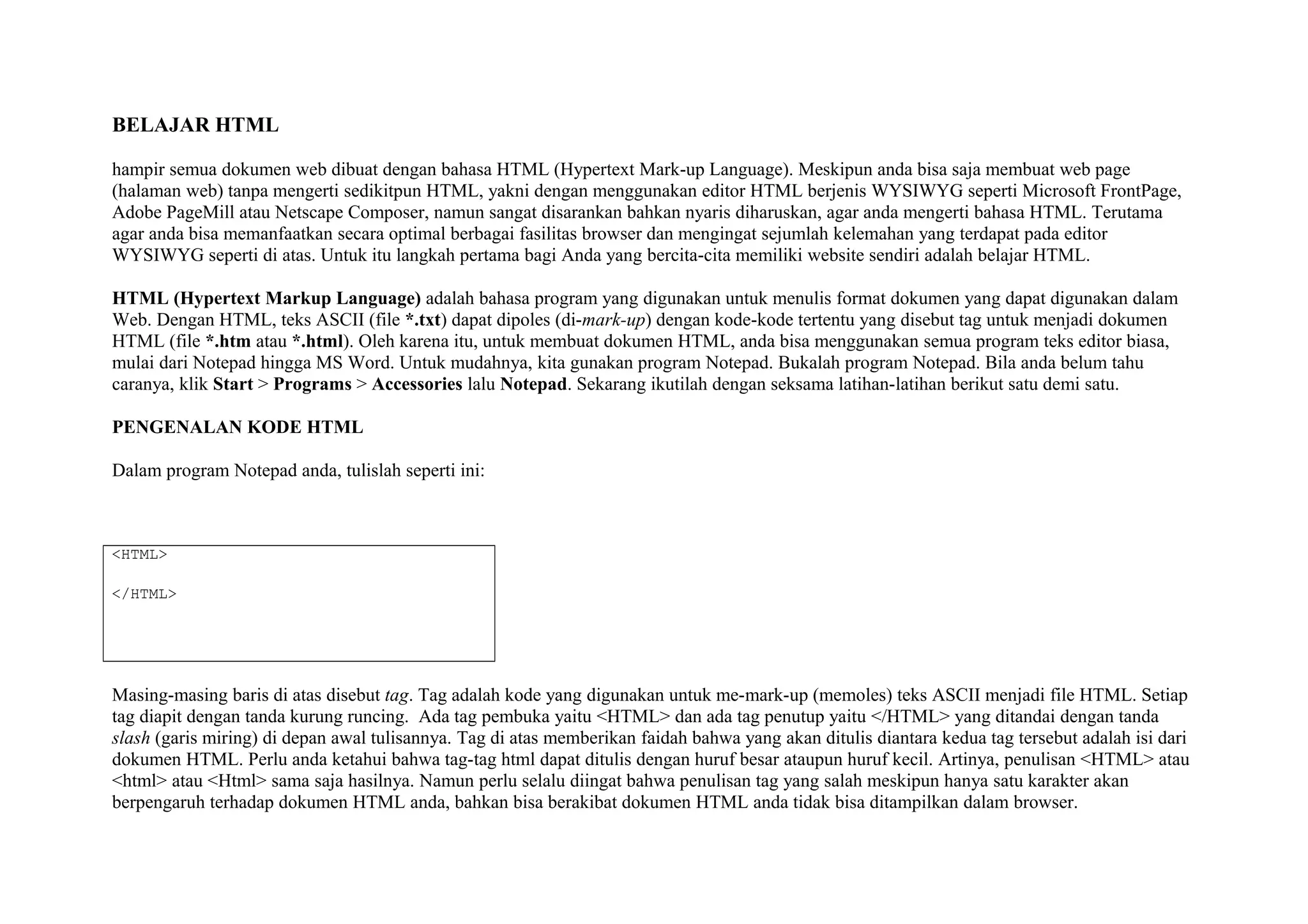 Dokumen ini menjelaskan dasar-dasar belajar HTML untuk membuat halaman web, termasuk penggunaan tag dasar seperti <html>, <body>, <head>, dan <title>. Ditekankan pentingnya memahami HTML agar dapat mengoptimalkan penggunaan browser dan memanipulasi tampilan halaman web. Terdapat juga contoh tag untuk format teks, penulisan baris, paragraf, dan penggunaan atribut untuk mengatur warna dan tampilan.
