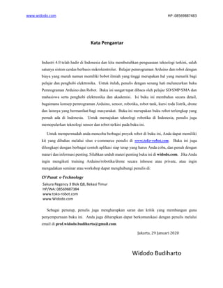 Buku ini membahas pemrograman Arduino dan robotik untuk pelajar dan penghobi dengan penekanan pada teknologi terkini dalam industri 4.0 di Indonesia. Disertai dengan contoh proyek dan panduan praktis, buku ini bertujuan untuk mempopulerkan teknologi robotika dan memungkinkan pembaca untuk melakukan eksperimen dengan berbagai komponen elektronika. Penulis juga menawarkan dukungan untuk pelatihan dan menyediakan materi tambahan melalui situs webnya.