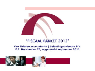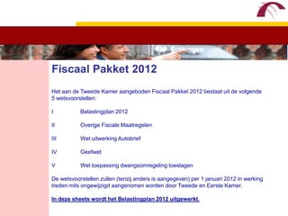 WelkomFiscaal Pakket 2012Hetaan de Tweede Kamer aangeboden Fiscaal Pakket 2012 bestaat uit de volgende5 wetsvoorstellen:I Belastingplan 2012II Overige Fiscale MaatregelenIII Wet uitwerking AutobriefIV GeefwetV Wet toepassing dwangsomregeling toeslagen De wetsvoorstellen zullen (tenzij anders is aangegeven) per 1 januari 2012 in werking treden mits ongewijzigd aangenomen worden door Tweede en Eerste Kamer.In deze sheets wordt het Belastingplan 2012 uitgewerkt.
