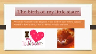 María was excited when she found out at age 17 that her mother was pregnant, as she had always wanted a sister. When María was 16, her father was diagnosed with kidney disease and the family went through a difficult time. However, after María's little sister Daffne was born nine months later, their father began recovering quickly from his illness. By the time María turned 18, her father had fully recovered, and María attributes this recovery to the birth of her sister, bringing happiness back to their family. María enjoys spending time playing with her two-year-old sister Daffne in the park.