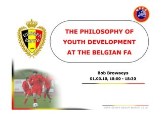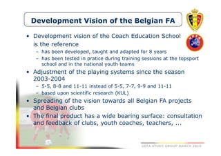 The document outlines the Belgian FA's youth development philosophy, emphasizing fun and learning through play, structured education, and a zone philosophy that improves players' understanding and decision-making. It details a continuous development model that includes technical, tactical, mental, and physical objectives across different phases of player growth. Additionally, it highlights the importance of creating a strong learning environment focused on individual player growth and decision-making.
