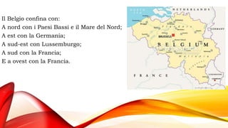 Il Belgio confina con diversi paesi europei ed è caratterizzato da una monarchia parlamentare con Bruxelles come capitale. Le principali città come Anversa, Bruges e Charleroi hanno una ricca storia culturale ed economica, interessante per il turismo e l'industria. Il paese gode di un clima atlantico e possiede un'ampia rete di fiumi, mentre l'economia è diversificata nei settori primario, secondario e terziario.