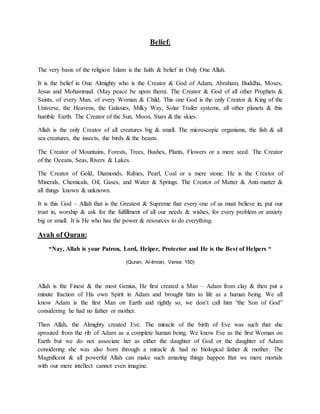 Belief in Islam is based on faith in one God, Allah, who is the creator of all things in the universe and all prophets including Adam, Abraham, Buddha, Moses, and Jesus. Allah created humans, animals, plants, minerals, and all other things seen and unseen. It is this one God that Muslims must believe in, trust, worship, and ask for help. The Quran teaches that Allah is the greatest and most powerful being capable of anything merely by saying "Be!". Muslims are promised forgiveness and paradise if they believe in the oneness of Allah and do righteous deeds. The fundamental Islamic creed is that there is no God but Allah and Muhammad is his messenger.