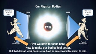 The document discusses how physical pain can manifest from emotional attachments like pride, fear, and pain itself. It suggests focusing first on the physical body to alleviate pain, but notes this does not work because of the emotional component. It then suggests focusing on the emotional body to change one's relationship with pain, but says this also does not work if still committed to believing pain is inevitable. Finally, it proposes focusing on one's beliefs around pain, acknowledging pain is a choice rather than necessity, which opens up possibilities for who one can be and what worlds one can create.
