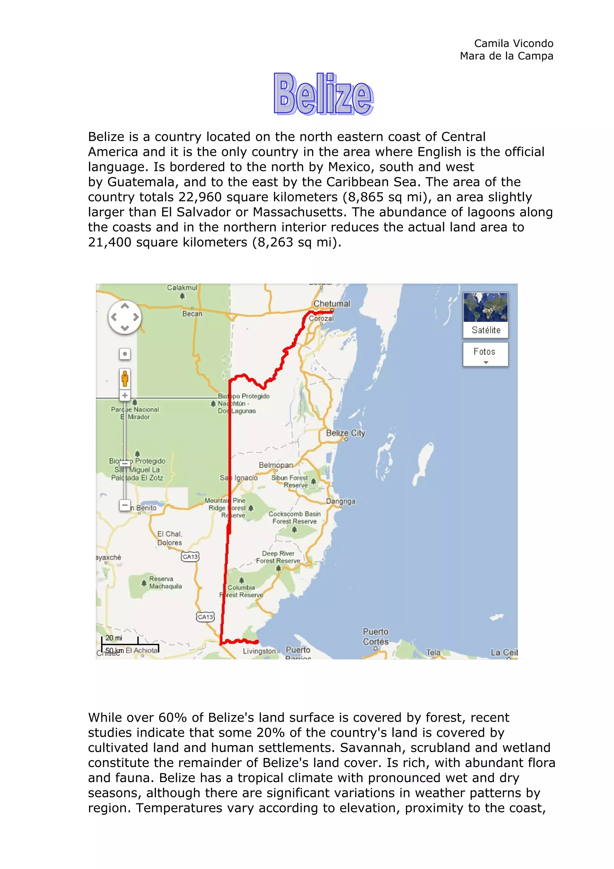 Belize is located in Central America and is the only English-speaking country in the region. It is bordered by Mexico, Guatemala, and the Caribbean Sea. Belize has a tropical climate with wet and dry seasons. Over 60% of Belize is forested but 20% is used for agriculture and settlements. Belize's economy relies heavily on tourism, with natural attractions like the Barrier Reef, islands, rivers for water sports, jungle reserves, and Maya ruins. Popular sports include football, basketball, volleyball, and cycling.