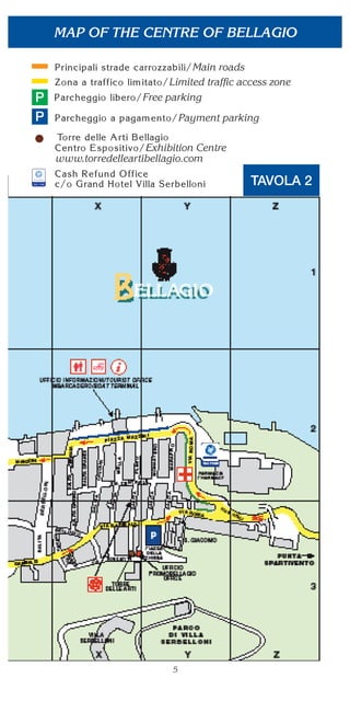 This document contains a map of Bellagio and surrounding areas with labels for various locations, including boat terminals, parking areas, roads, and hamlets. It also includes indexes and sections with useful addresses, emergency contact information, details on how to reach Bellagio, general information about the town, listings of churches, tours, transportation services, accommodations, restaurants, attractions, and more.