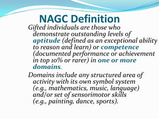 The federal definition describes gifted students as those who demonstrate high achievement capability or potential in areas such as intellectual, creative, artistic or leadership capacities and need services beyond typical school programs to fully develop their abilities. The NAGC definition describes gifted individuals as those who show outstanding aptitude or competence defined as exceptional ability to reason and learn or documented top 10% performance in one or more domains including academics, music, language or motor skills. Winebrenner's definition describes gifted students as those whose abilities exceed grade level expectations by two or more years in one or more areas.