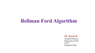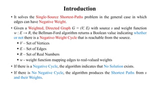 The Bellman-Ford algorithm addresses the single-source shortest-paths problem for directed graphs with potentially negative edge weights, returning whether a negative-weight cycle exists and producing shortest path estimates if not. It works by repeatedly relaxing edges up to |V| - 1 times, where V is the set of vertices, and operates in O(VE) time. The algorithm guarantees correct shortest path calculations if no negative cycles are reachable from the source and provides a framework for vertex predecessors to construct these paths.