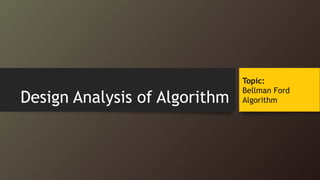 The document provides a comprehensive overview of the Bellman-Ford algorithm, which is used to find the shortest paths from a source vertex to all other vertices in a directed graph, specifically in cases where negative edges are present. It discusses the algorithm's implementation, including initialization, relaxation of edges, and detection of negative-weight cycles, along with its time complexity and real-life applications such as in Google Maps and telephone networks. Limitations include its inability to handle graphs with negative weight cycles and slower adaptation to changes in network topology.