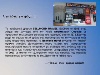 εμάρ……… Τν ηαμηδησηηθφ γξαθείν BELLMOND TRAVEL ηδξχζεθε ην 1986 ζηελ Αζήλα ζην Σχληαγκα απφ ηελ Κπξία Αποζηολάκη Οςπανία κε πξνζσπηθή ηεο εκπεηξία ζην ρψξν ηνπ ηνπξηζκνχ απφ ην 1975.Έρνληαο κέρξη θαη ζήκεξα ηα 37 ρξφληα ζαλ πξνυπεξεζία θαη ηελ γλψζε ζε θάζε είδνο ηνπξηζηηθνχ πξντφληνο ην Belmond travel εγγπάηαη ηελ παξνρή πςεινχ επηπέδνπ εμππεξέηεζεο ζηνπο πειάηεο ηνπ Πξνζθέξνληαο νινθιεξσκέλα παθέηα ππεξεζηψλ κε ζεβαζκφ ζηηο αλάγθεο θαη ζηηο απαηηήζεηο ησλ πειαηψλ ηνπ, ε επηρείξεζε κεηαθέξζεθε ζηελ Αλάβπζζν ην 2007 κε ζθνπφ ηελ εμππεξέηεζε ηφζν ησλ θαηνίθσλ ηεο πεξηνρήο φζν θαη φισλ απηψλ πνπ ζα ην επηιέμνπλ γηα ηα ηαμίδηα ηνπο ……Ταξίδια στον όμοπυο κόσμο!!!!