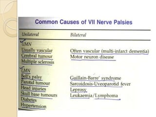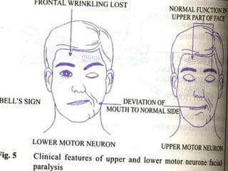 The document discusses facial palsy, particularly Bell's palsy, which is an acute, idiopathic lower motor neuron facial paralysis. It outlines the clinical presentation, diagnosis, and treatment options, emphasizing the importance of early intervention for better prognosis. Approximately 80% of patients recover within a few weeks, with various factors influencing recovery outcomes, including the severity of the palsy at presentation.