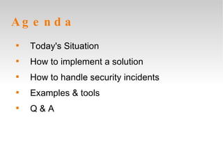 The document discusses how to effectively handle security incidents. It recommends implementing continuous event management with tools, procedures, and integration across systems to gain visibility into the network. A four-step process of collection, normalization, indexing, and storage is proposed to analyze security data. The presentation also outlines establishing procedures for change management, incident response, and prevention through security awareness.