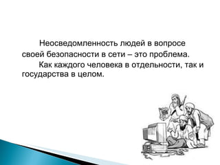 Документ обсуждает проблему кибертерроризма и его угрозы для частных лиц и государств, акцентируя внимание на неосведомленности общества в вопросах интернет-безопасности. Он описывает методы, используемые киберпреступниками, такие как пропаганда, вербовка и дезинформация, а также приводит примеры известных киберпреступлений. В заключение предлагаются рекомендации по повышению безопасности в сети для предотвращения попадания в ловушки кибертеррористов.