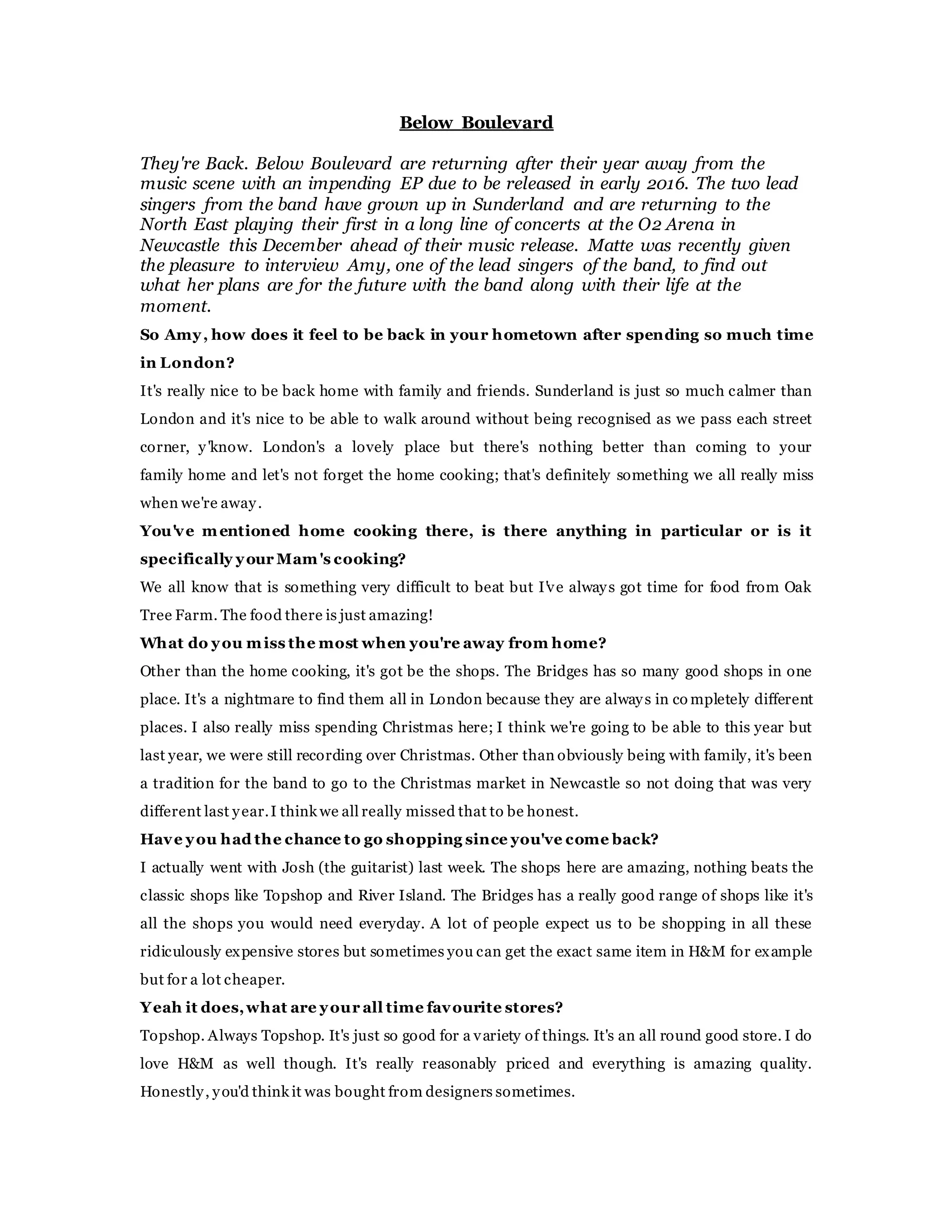 Below Boulevard is a band from Sunderland returning after a year away with a new EP scheduled for early 2016. They will play their first concert of their upcoming tour in Newcastle in December ahead of the EP release. One of the lead singers, Amy, discusses the band's plans in an interview, mentioning enjoying being back home in Sunderland for the comforts of family, friends, and local shops and food. She looks forward to the band's touring plans for 2016, which will include upgraded production compared to last year and visits to new places across the UK and Ireland.