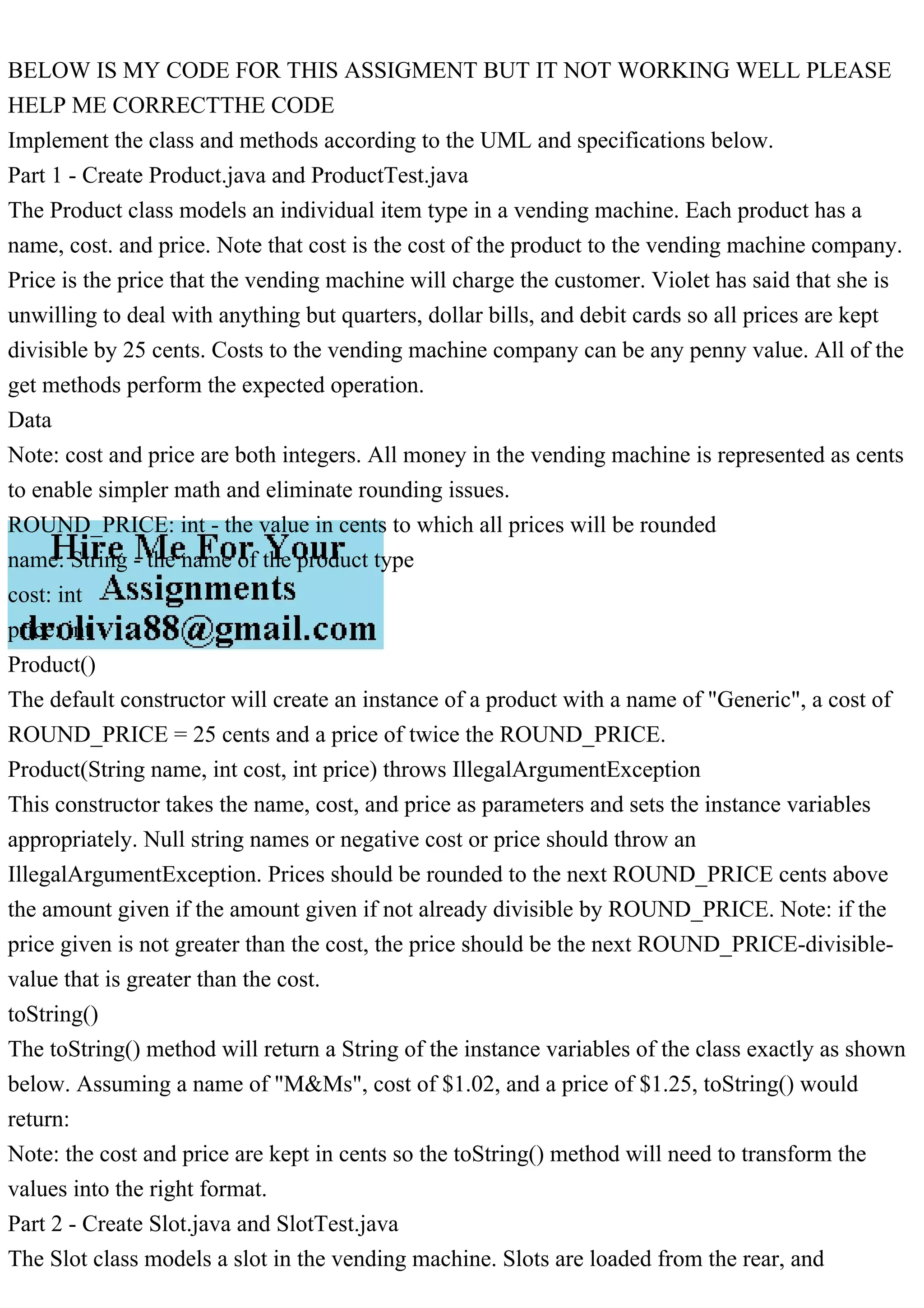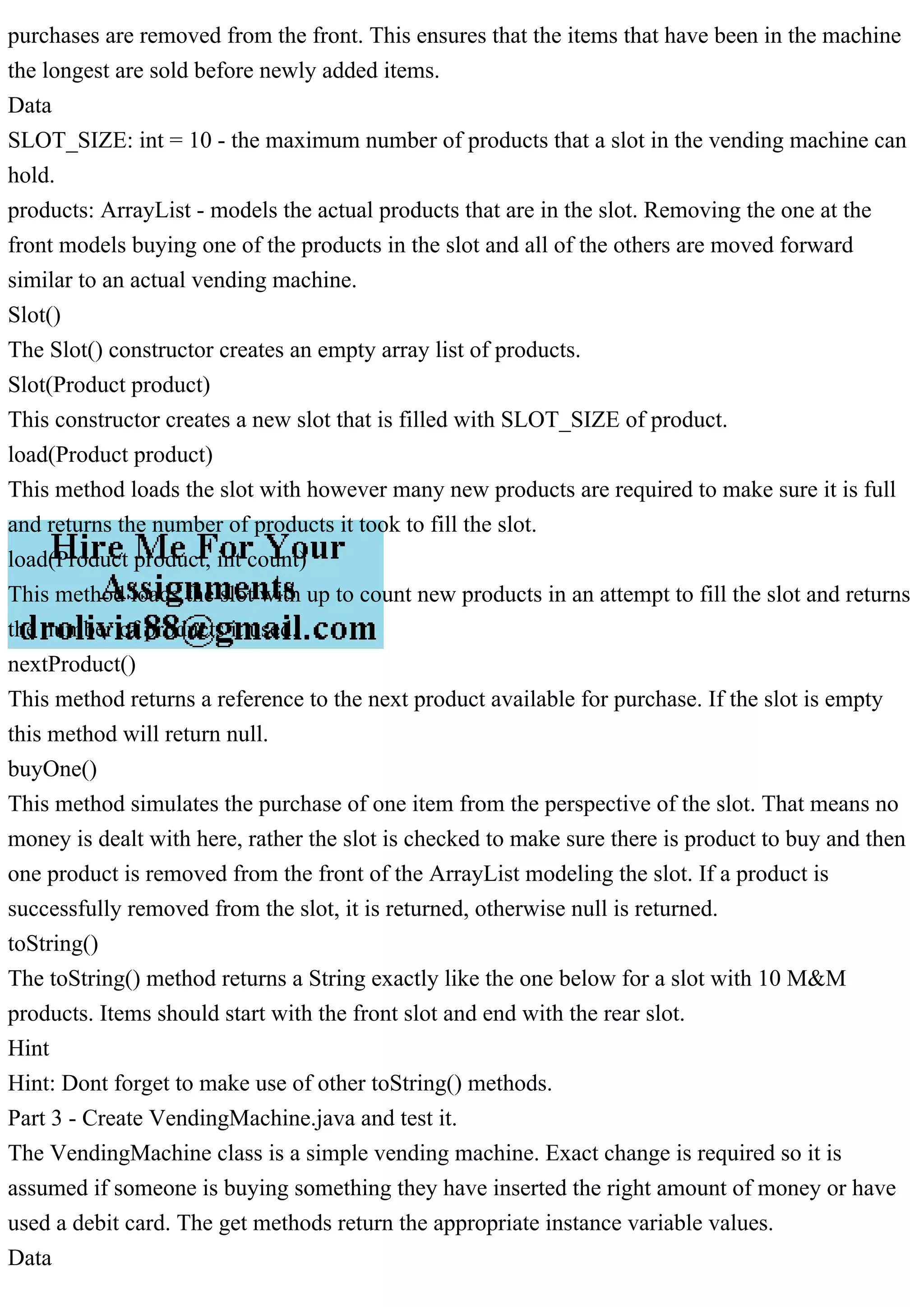 The document outlines the specifications and implementation of a vending machine system, including classes for product, slot, vending machine, drink machine, change-making machine, snack machine, and a simulator for running the business. Each class is designed to handle specific functionalities such as managing products, processing purchases, maintaining profits, and ensuring compatibility with various payment methods. Additionally, it includes error handling for invalid input scenarios and requires adherence to specific data formatting for proper operations.