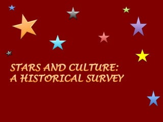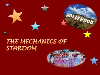 This document summarizes the history of stardom in Hollywood from the silent film era to contemporary times in 3 pages. It discusses [1] how the advent of sound exposed the artifice of silent films and established stars as economic drivers for studios. It then [2] analyzes the construction of different star personas and images across different decades from the 1920s to the 1960s/70s, how they reflected and shaped social norms. Finally, it [3] notes that stars continue to be commodities manufactured primarily for economic purposes but that also provide pleasure to audiences through their performances.
