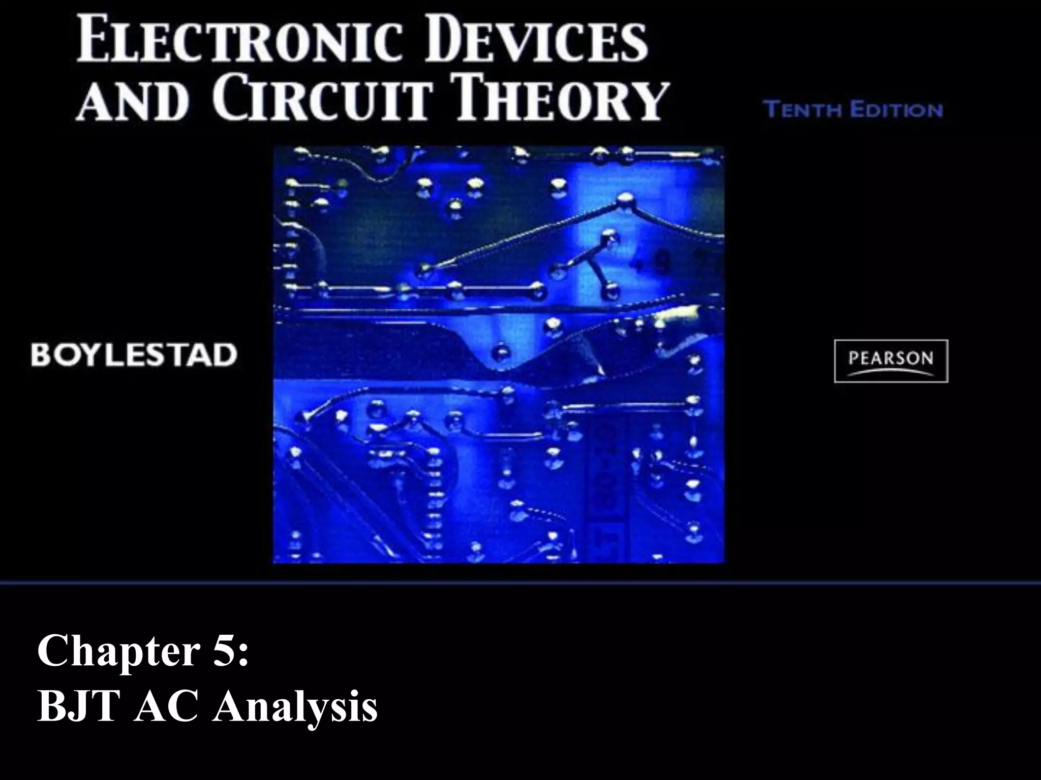 This document summarizes key concepts about BJT AC analysis from Chapter 5 of the textbook. It discusses two common models used for small signal AC analysis: the re model and hybrid equivalent model. The re model represents the BJT as a diode and current source and is designed for specific circuit conditions. It then provides details on analyzing several common BJT configurations, including common-emitter, using the re model, discussing input impedance, output impedance, voltage gain and current gain. It also briefly introduces the feedback pair and current mirror circuits.