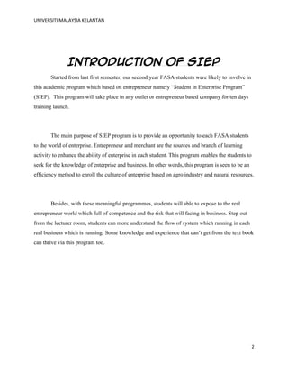 The document outlines a student's 10-day internship at Kuan Gei Porridge Stall, including the objectives of learning about the company's background and owner, observing the work environment and routines, building relationships with the owner, and understanding the marketing, finances, and management of the small business. The student analyzes the business's strengths of low costs and location but notes weaknesses of limited space and lack of promotion.