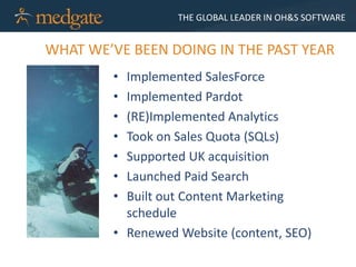 The document discusses an OH&S software solution company that operates globally and focuses on content marketing to generate leads. Over the past year, the marketing team of 4 implemented Salesforce and Pardot, relaunched the website focusing on content and SEO, and launched paid search. They qualify leads through a process and key metrics include the sales funnel from marketing, average cost per lead, and number of qualified leads in the pipeline.
