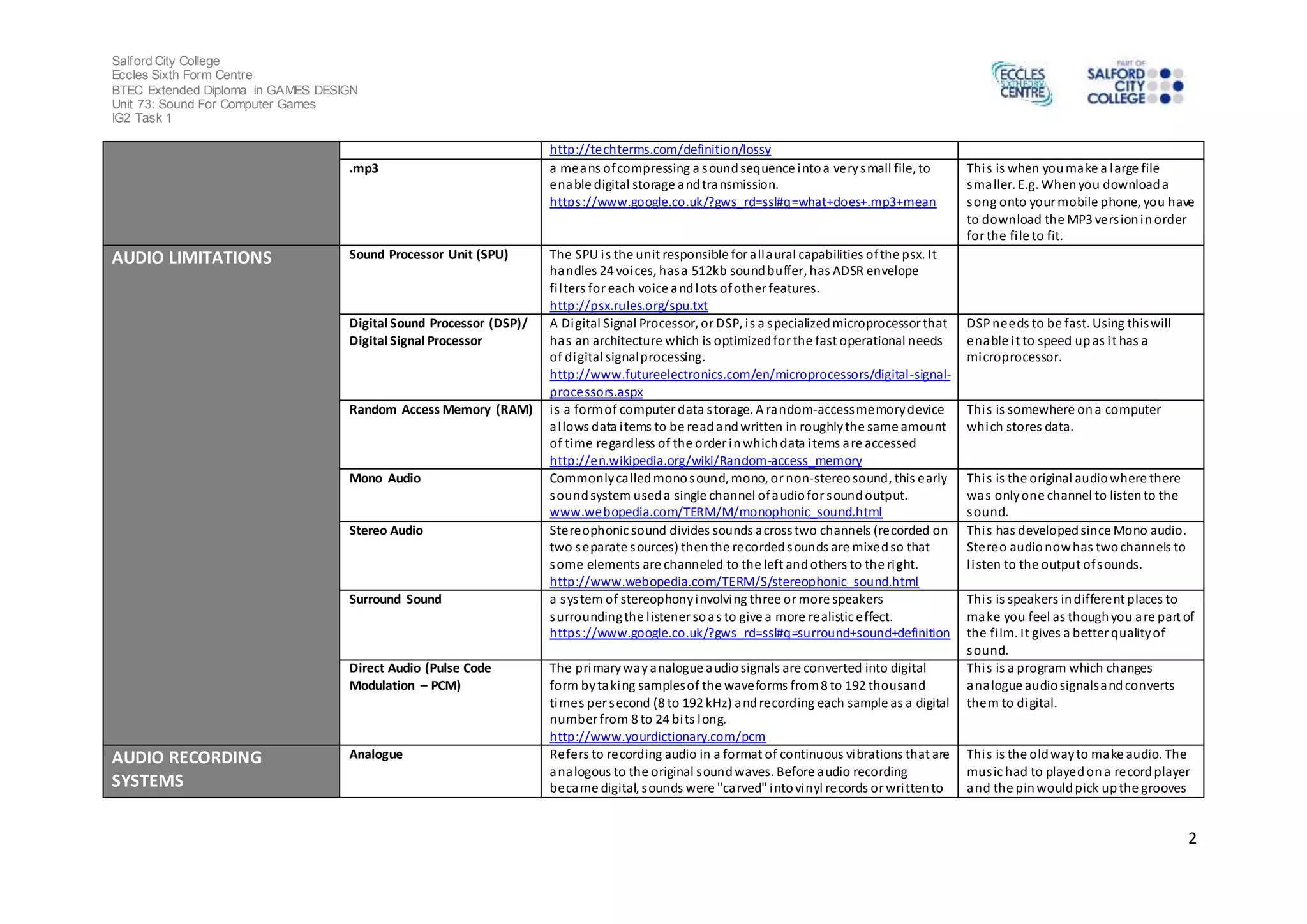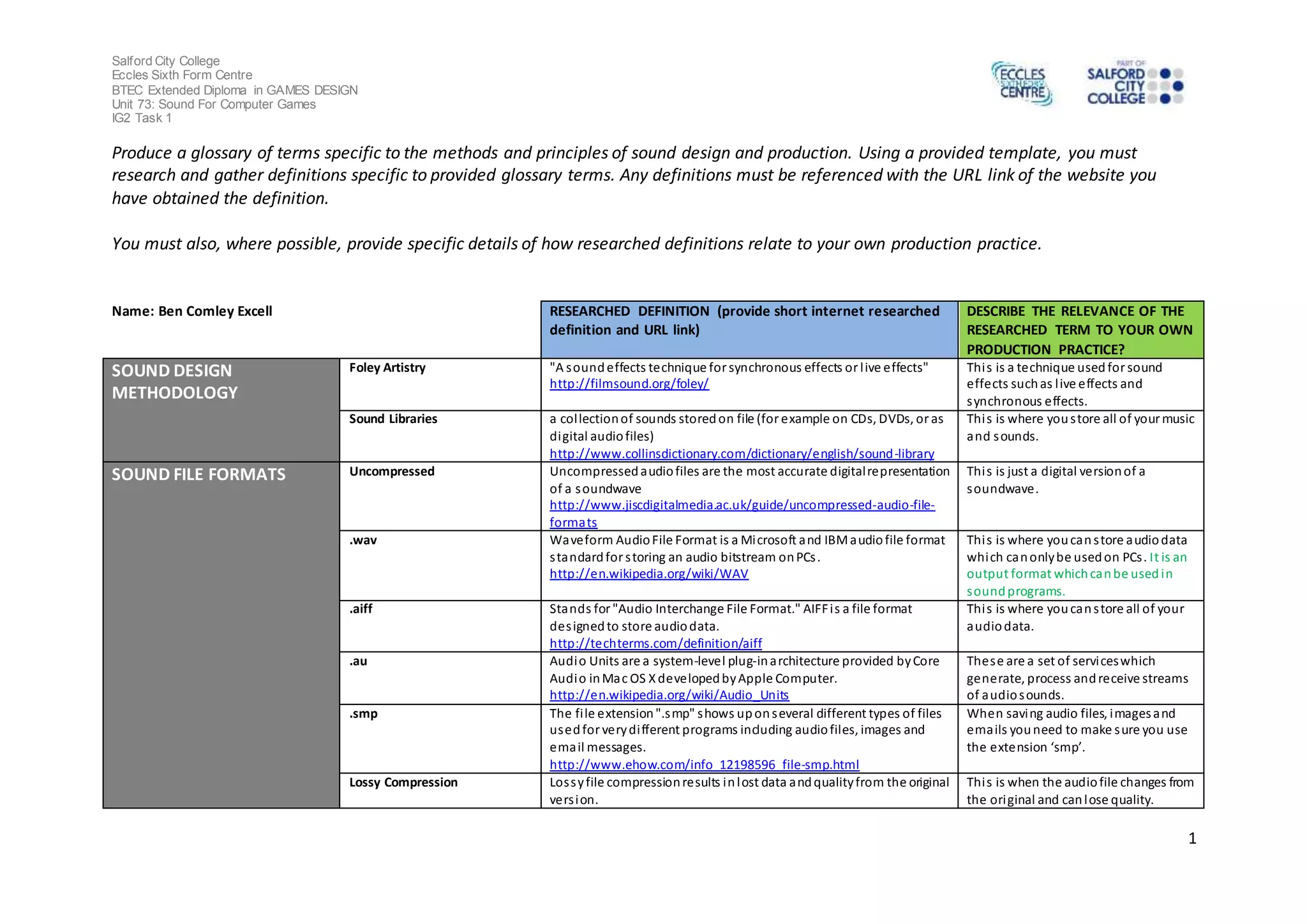 The document is a glossary assignment for a BTEC Extended Diploma in Games Design course. It contains definitions for various terms related to sound design and production. The student was asked to research definitions for the provided glossary terms and include how each term relates to their own production practice. Definitions are provided for terms like foley artistry, sound libraries, audio file formats (wav, aiff, au), compression types (lossy, mp3), audio hardware limitations, recording systems (analog, digital disc formats), MIDI, software tools, and audio sampling concepts.