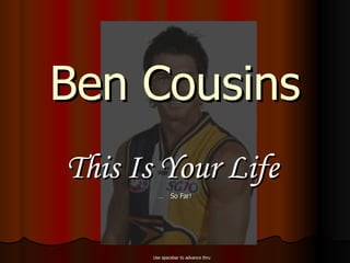 Ben Cousins was born in 1978 in Geelong, Victoria. He played for West Coast Eagles from 1995-2007, winning several awards including the Brownlow Medal in 2005. His career was marred by ongoing drug and legal issues beginning in the early 2000s. After being sacked by West Coast, he played for Richmond in 2008-10, winning the Brownlow Medal again in 2010 as Richmond's captain. However, his battles with substance abuse continued throughout and after his playing career.