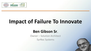 The document discusses the impact of failure to innovate in business. It notes that executives want innovation but companies can become technologically stagnant over time. The business model and approach to innovation must change as the company lifecycle transforms. Truly innovative thinking requires going "out of the box" to understand customers' needs rather than make assumptions. Failure to innovate and adapt the business model can lead companies to become detached from reality and ultimately fail like Kodak. The key is to understand customers' pains rather than just focusing on potential gains from new products or features.