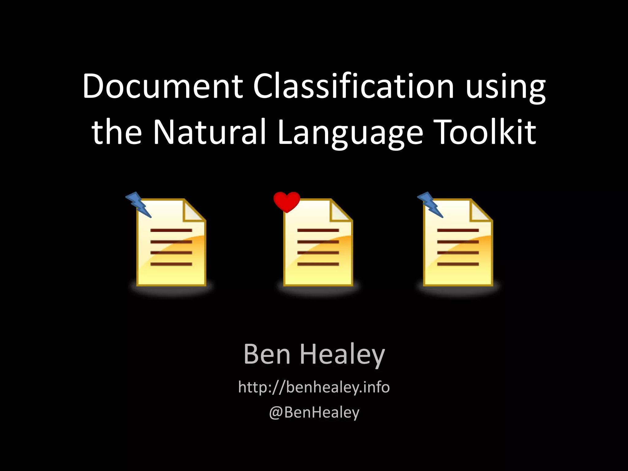 This document discusses document classification using the Natural Language Toolkit (NLTK). It describes extracting features from a dataset of Enron emails, training naive Bayes and decision tree classifiers on the features, and evaluating the classifiers' performance. Key steps include preprocessing the email data, extracting features like word counts and frequencies, training classifiers on a sample of the data, and measuring accuracy on a test set. The document cautions that the results demonstrate potential issues like biased samples and prior knowledge that require further iterative modeling.