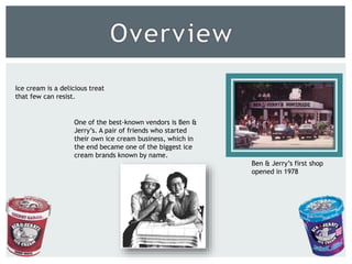 Childhood friends Ben Cohen and Jerry Greenfield started their ice cream business in 1978 by opening their first ice cream shop in Burlington, Vermont after taking an ice cream making class. Their unique flavors and commitment to community engagement helped the shop become popular. As demand grew, they opened more locations in Vermont and eventually expanded outside the state. By the 1980s, Ben & Jerry's had become a successful national brand known for innovative flavors and social activism. The company faced challenges with distribution rights but continued growing, achieving over $32 million in sales by 1987.