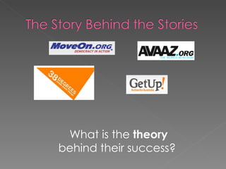 Barack Obama's Organizing for America group utilized digital tools and tactics like calls, letters, petitions, and social media posts to mobilize citizens and transform their opinions, relationships, votes, creativity, and money into political and social change. They aimed to directly influence decision makers through "speak up" tactics or influence the public through "speak out" tactics, and build long-term grassroots power through organizing. Over four years, the group contacted millions of officials, held thousands of events, trained volunteer leaders, and raised over $30 million.