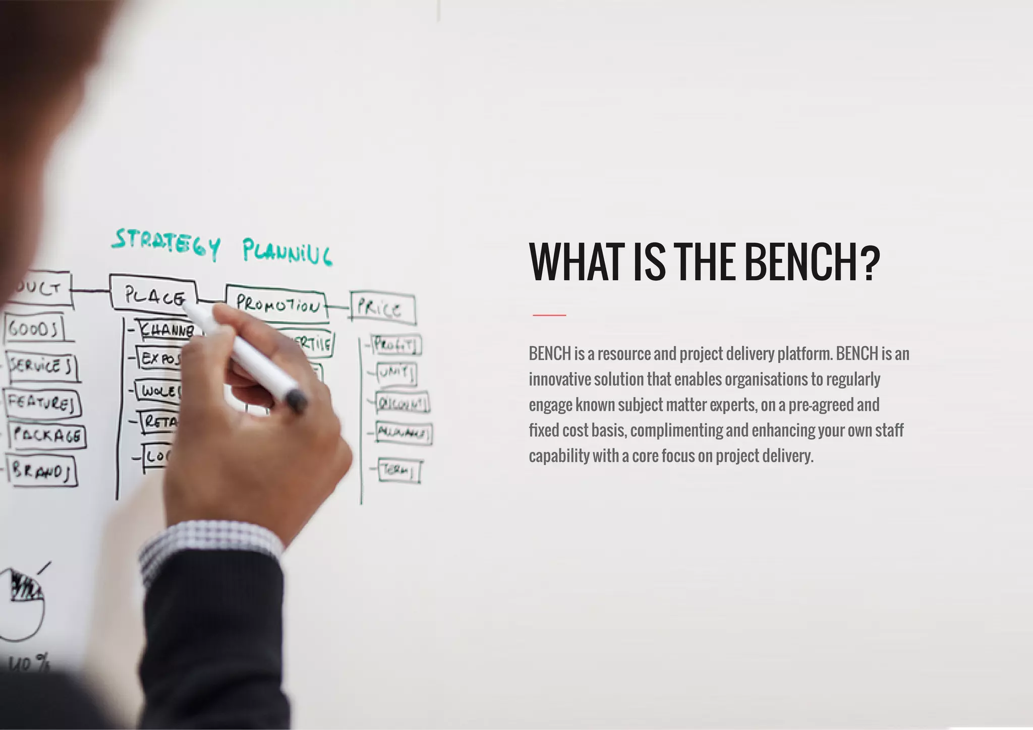 Bench is a project delivery platform that connects organizations with subject matter experts at a fixed cost to enhance staffing capacity. It offers transparency and project-based results by providing vetted associates for peak times and specialized skills. The service includes a comprehensive delivery methodology to ensure successful project engagement and compliance.