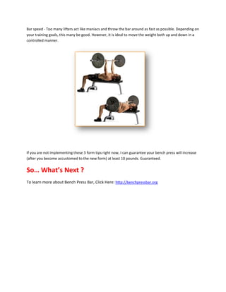 Important tips are provided for improving bench press form. Maintaining parallel forearms keeps force directed upwards for a stronger lift. Touching the bar to the lower chest in the "power zone" below the nipples allows for maximum strength. Moving the bar both up and down in a controlled manner, rather than throwing it around quickly, is ideal for building strength. Implementing these three form tips can increase one's bench press by at least 10 pounds.