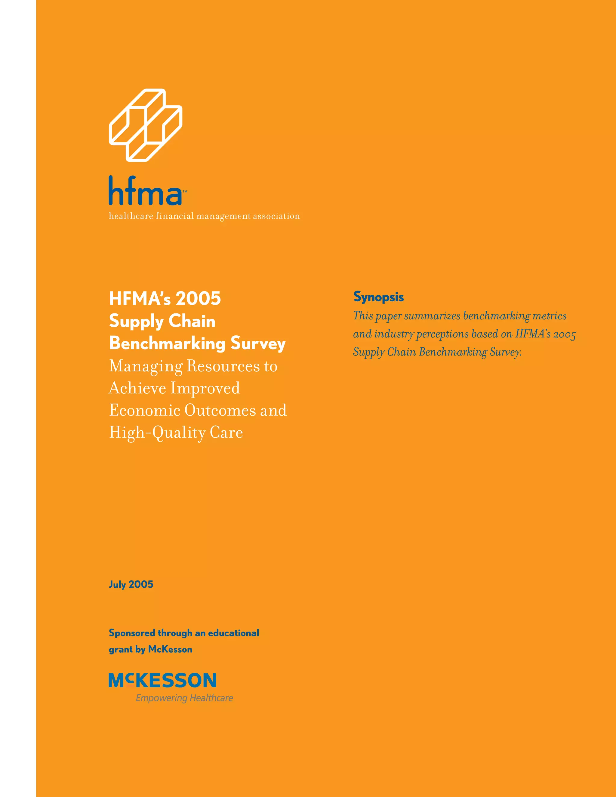 This document summarizes the key findings of a 2005 survey on healthcare supply chain management conducted by HFMA. The survey identified areas of high opportunity to reduce costs, including physician/clinical buy-in, IT investments, and value analysis. Respondents estimated they could reduce supply costs by an additional 2.5% annually by focusing on standardizing items and improving purchasing controls and physician involvement. While most hospitals have standardization initiatives, physician awareness remains low. The document discusses strategies for improving physician buy-in, such as ensuring transparency and a process for evaluating new products.
